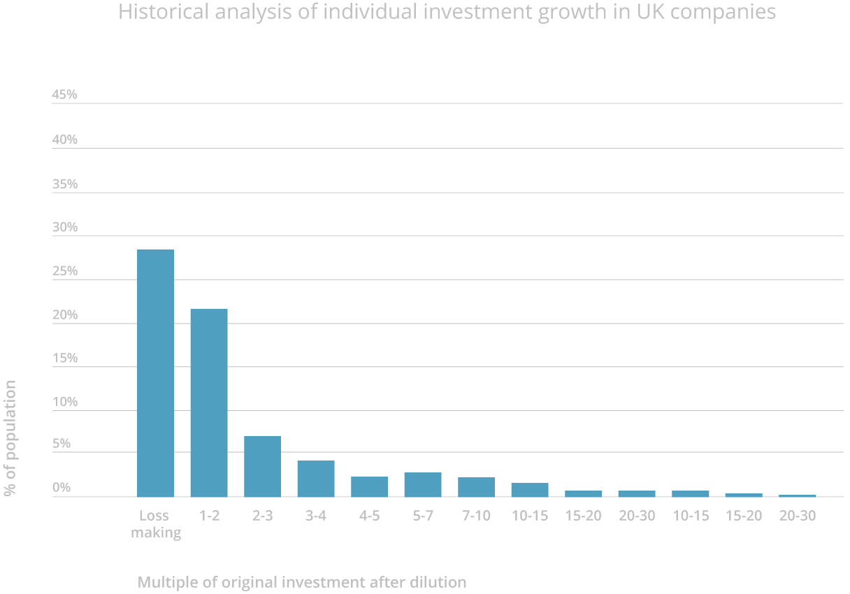 The UK startup market follows a Power Law distribution. This means that a small minority of companies are responsible for the lions share of returns.