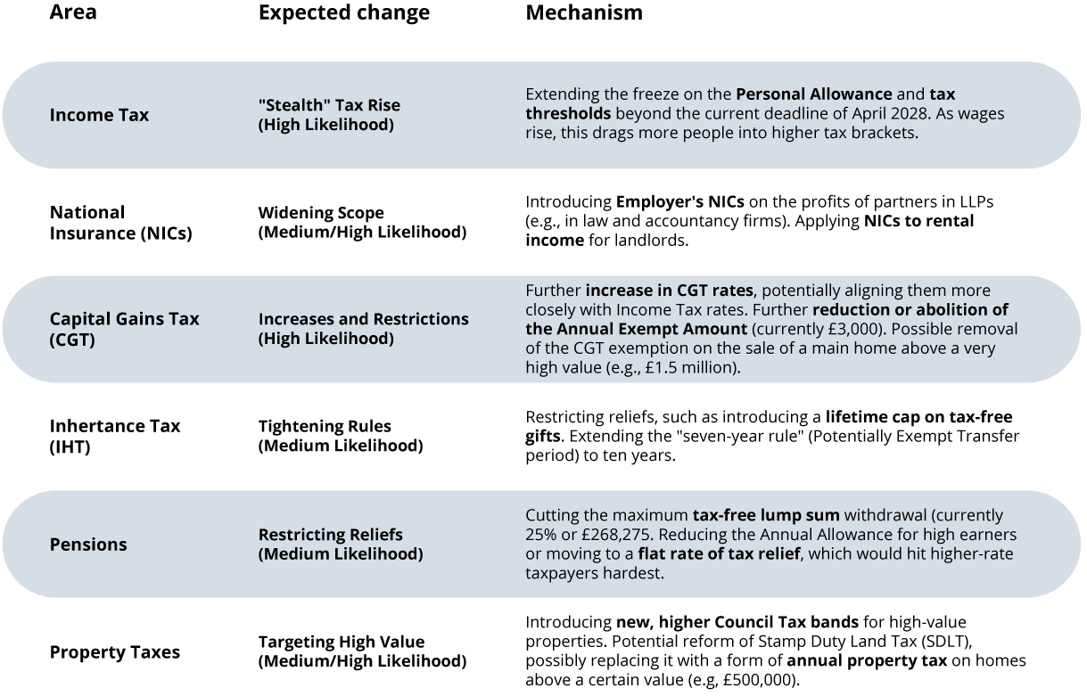 In the face of expected tax rises, particularly those targeting wealth, capital gains, and high earners' reliefs, proactive tax planning becomes crucial.